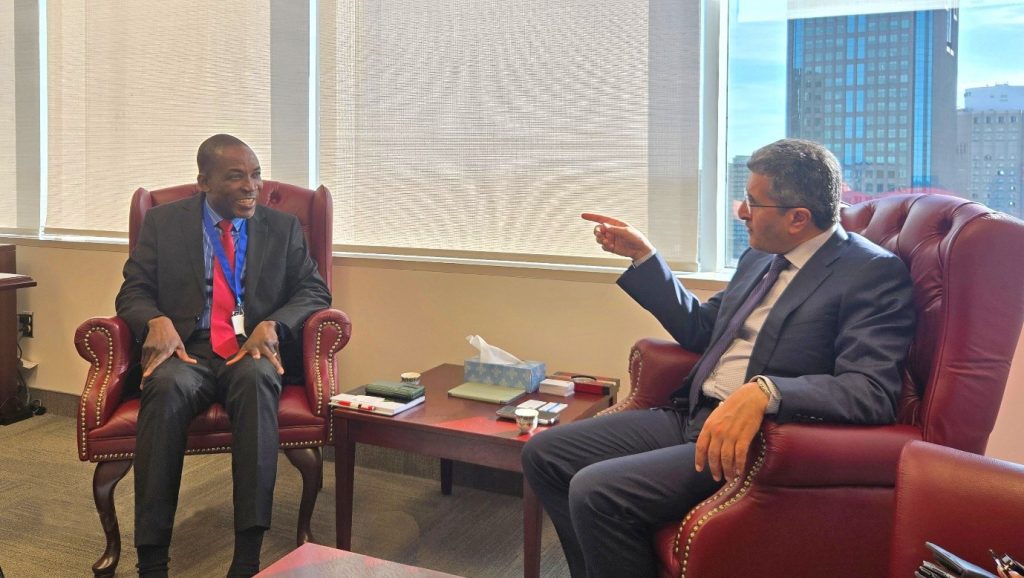 Rev. Stephen Wilfred Arthur (left), Acting Director-General of the Ghana Civil Aviation Authority, in a meeting with Mr. Mohamed bin Al-Hajri, Director-General of the Qatar Civil Aviation Authority, during the ICAO General Assembly in Montréal, Canada.